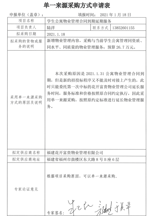 采用单一来源采购方式的原因及说明:本次采购原因是2021.1.31公寓物业管理合同到期,但是新的招投标程序又不能及时对接上产生的,此时只能委托第一次中标的花开富贵物业管理公司延长服务时间,服务标准和价格按照原合同约定执行,因此采用单一来源采购,按照原约定标准进行延长物业管理服务。